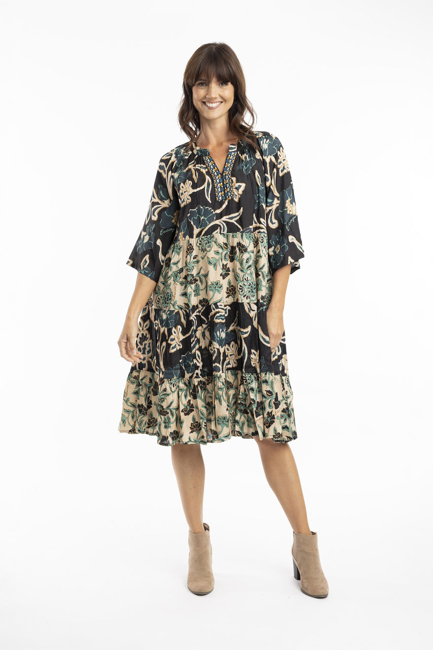 Deze kleurrijke jurk heeft een V-hals met knoopjes en een elastische taille met koordje en lange mouwen.