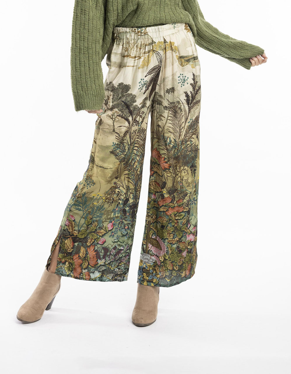 Deze wijde broek heeft splitten aan de onderzijde en steekzakken.