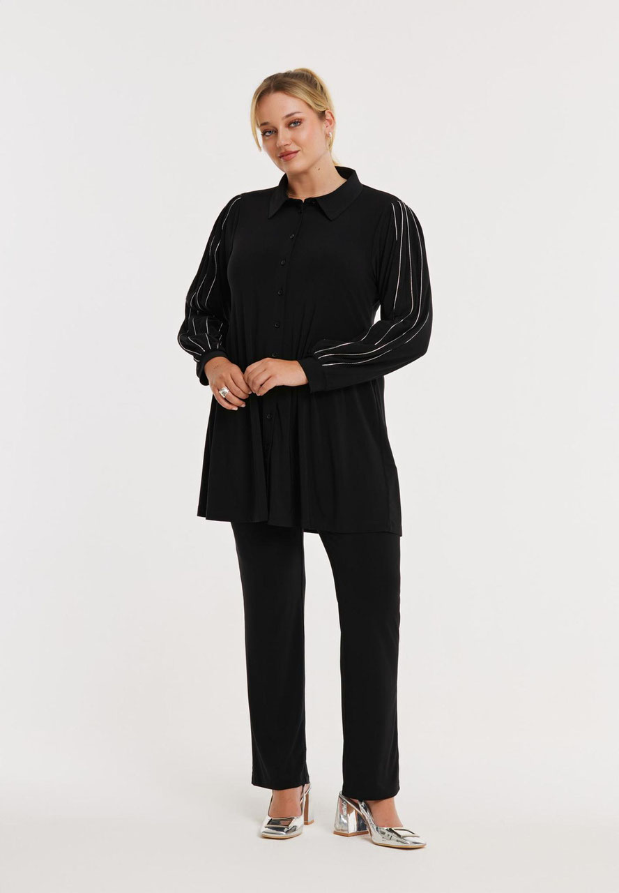De blouse heeft een doorlopende knoopsluiting aan de voorkant. Lange mouwen met een zachte elastische rand die een decoratief en elegant geplooid randje bij de pols creëert. Versierd met glinsterende steentjes die de look een vleugje glamour geven.