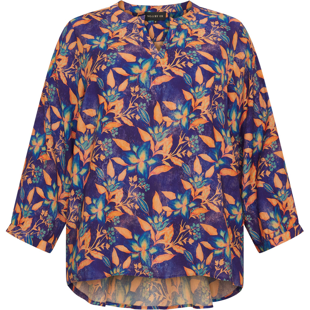 Leuke blouse die aan de voorkant korter is dan de achterkant. De blouse heeft een knoopsluiting, kraagje en een print op de achterkant.
